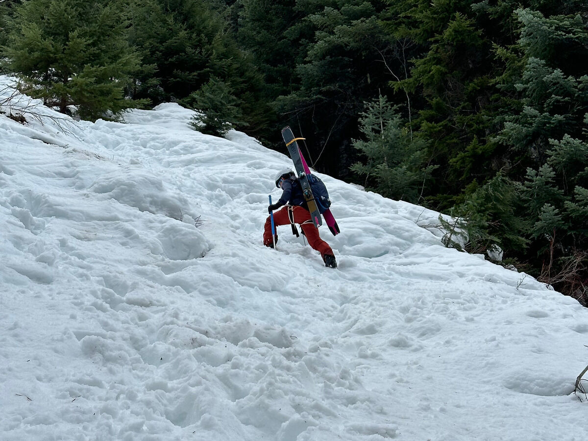 The obligatory boot out from the bottom of the drainage back into the ski area in weird snow